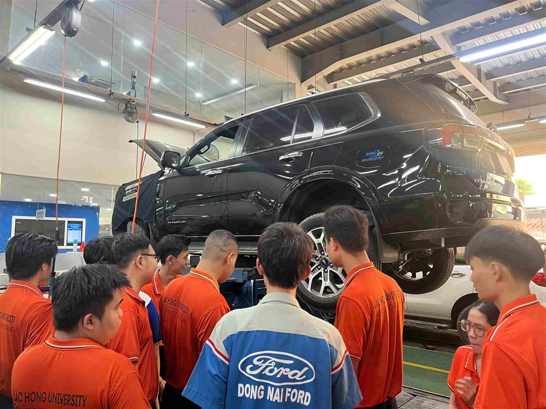 Tại buổi tham quan, sinh viên được đại diện Ford Đồng Nai giới thiệu tổng quan về mô hình hoạt động của doanh nghiệp, quy trình tiếp nhận – sửa chữa – bảo dưỡng xe theo tiêu chuẩn Ford toàn cầu, cũng như các yêu cầu về kỹ năng, tác phong và an toàn lao động trong môi trường làm việc thực tế. Đặc biệt, sinh viên được trực tiếp quan sát hệ thống xưởng dịch vụ, trang thiết bị chẩn đoán hiện đại và quy trình kiểm tra kỹ thuật các dòng xe Ford.