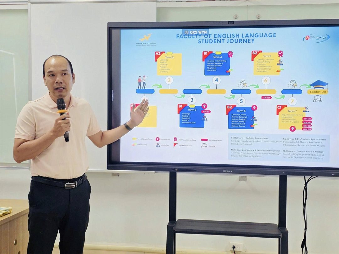 Nhằm tối ưu hóa trải nghiệm và tăng cường sự gắn kết của người học, sáng ngày 11/3/2026, Khoa Ngôn ngữ Anh – Trường Đại học Lạc Hồng đã tổ chức buổi họp lấy ý kiến sinh viên về chương trình "Student Journey" (Hành trình sinh viên). Buổi họp diễn ra tại phòng D204, Cơ sở 2 với sự tham gia của Thầy Đặng Thi – Phó Trưởng khoa cùng đại diện sinh viên các khóa thuộc Khoa Ngôn ngữ Anh.