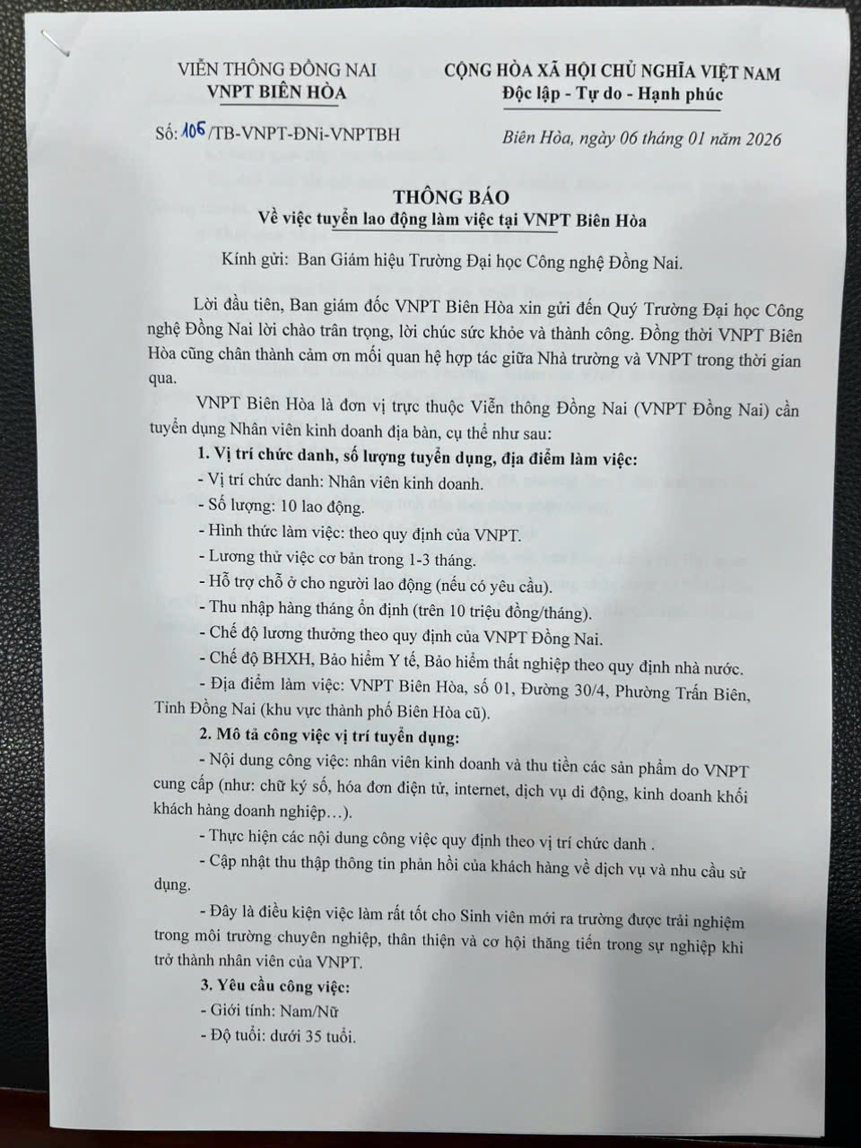 THÔNG BÁO TUYỂN DỤNG, VIỆC LÀM TOÀN THỜI GIAN LẦN 66, NĂM HỌC 2025-2026 (Viễn Thông Đồng Nai VNPT Biên Hòa).