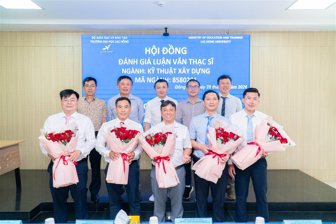 Ngày 28 tháng 3 năm 2026, tại phòng B203 cơ sở 1 của Trường Đại học Lạc Hồng, 05 học viên ngành Kỹ thuật xây dựng đã xuất sắc hoàn thành và bảo vệ thành công luận văn thạc sĩ của mình. Buổi bảo vệ diễn ra trong không khí trang trọng và đầy tính học thuật, đánh dấu một bước ngoặt quan trọng trong hành trình học tập và nghiên cứu của các học viên.