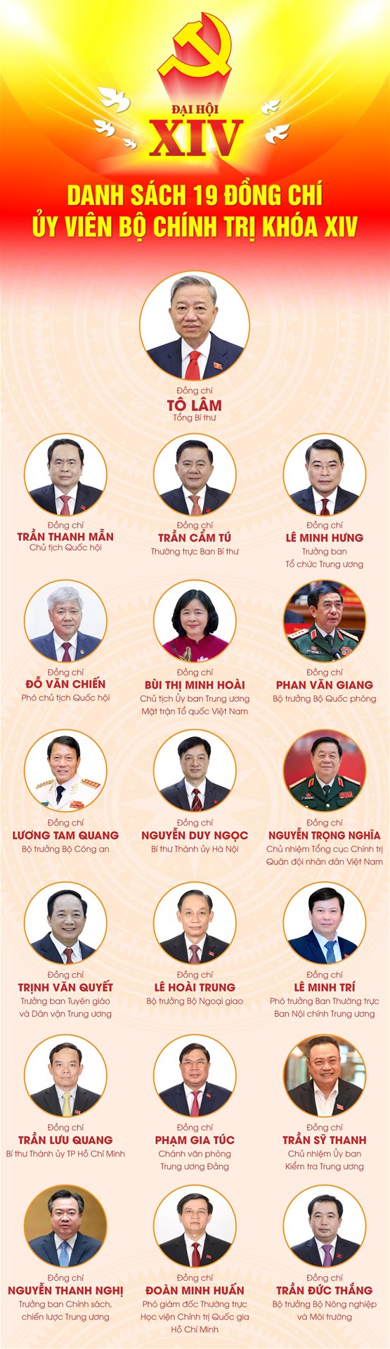 Với tinh thần đoàn kết, trí tuệ và đổi mới, Đại hội đã bầu ra 19 đồng chí Ủy viên Bộ Chính trị khóa XIV – những đồng chí tiêu biểu về bản lĩnh chính trị, phẩm chất đạo đức, năng lực, uy tín, đủ tâm và tầm để gánh vác trọng trách trước Đảng và Nhân dân trong giai đoạn phát triển mới của đất nước.