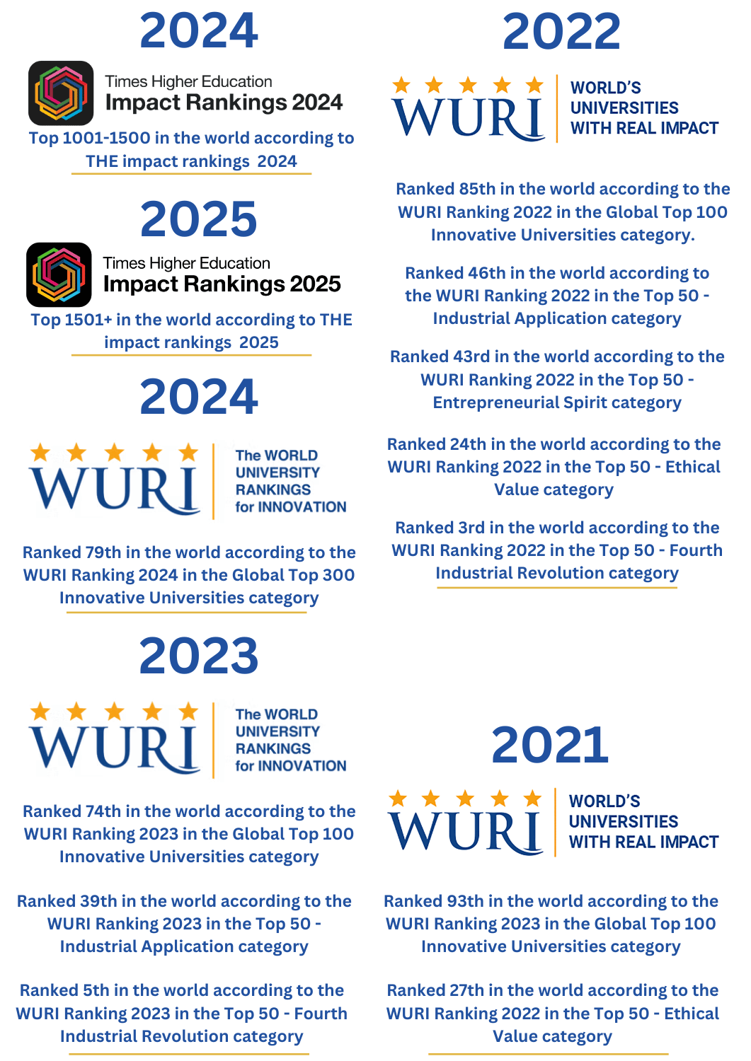 Bảng xếp hạng WURI đầu tiên năm 2020: Bảng xếp hạng đầu tiên này bao gồm Top 100 toàn cầu và Top 50 ở bốn lĩnh vực chính: Ứng dụng Công nghiệp, Tinh thần Khởi nghiệp, Giá trị Đạo đức, và Tính Di động và Mở cửa của Sinh viên. Trọng tâm của bảng xếp hạng là đo lường các hoạt động đổi mới và đóng góp thực tiễn của các trường đại học trong nhiều lĩnh vực, thay vì chỉ thành tích học thuật.