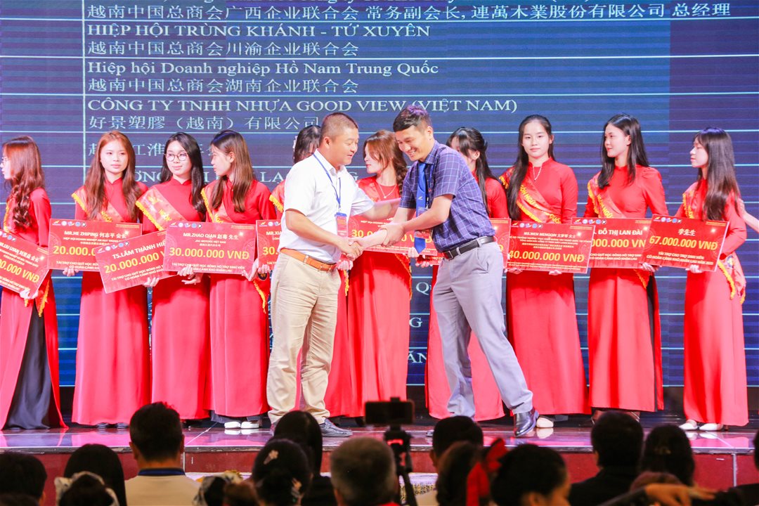 Assoc. Prof. Dr. Nguyen Vu Quynh (in blue) received scholarships from enterprises on behalf of LHU students.