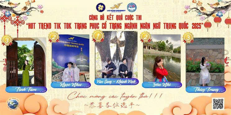 Trong năm học vừa qua, Ngành Ngôn ngữ Trung Quốc đã tổ chức nhiều hoạt động thiết thực, nổi bật là cuộc thi “ Trend TikTok Trang phục Cổ trang – Ngành Ngôn ngữ Trung Quốc LHU” diễn ra từ ngày 15/3 đến 25/3/2025. Cuộc thi thu hút hàng chục sinh viên tham gia với nhiều tác phẩm được đầu tư nghiêm túc, góp phần lan tỏa vẻ đẹp văn hóa Trung Hoa và tinh thần năng động của sinh viên. Kết quả chung cuộc, Ban Tổ chức đã lựa chọn và vinh danh các thí sinh xuất sắc, ghi nhận sự sáng tạo và nỗ lực trong quá trình dự thi.