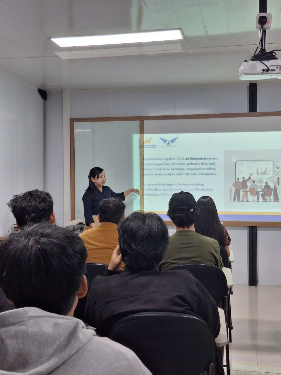 In the afternoon, the lecturer from the LHU Faculty of Information Technology conducted the first teaching session on the topic of Enterprise Information Systems. The lecture focused on the structure of enterprise information systems, factors influencing the level of Information Systems (IS) adoption in Vietnam, and the system implementation process within organizations. ESA Unggul students engaged in lively discussions, particularly regarding the comparison of information system models between Indonesia and Vietnam. Several real-world case studies were presented, such as LHU's internal Information System, AI Chatbots, Shopee, TikTok, and Lazada.