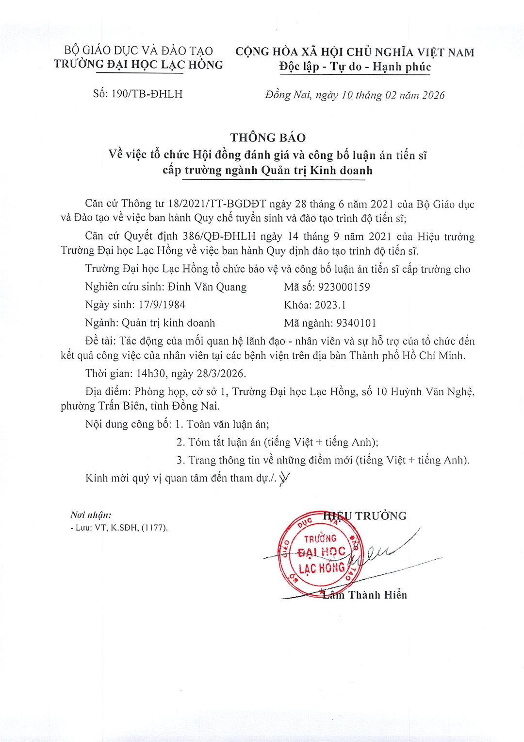 Thông báo lịch bảo vệ luận án tiến sĩ cấp Trường ngành Quản trị kinh doanh - NCS Đinh Văn Quang tháng 03 năm 2026