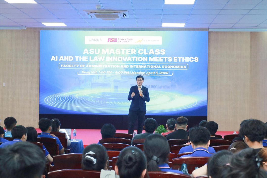 On the afternoon of April 6, 2026, the Faculty of Administration – International Economic, Lac Hong University, organized the ASU Master Class: Innovation Meets Ethics for students majoring in Law and Economic Law. The program was implemented within the framework of academic cooperation, aiming to equip students with foundational knowledge and a mindset to approach legal issues in the context of digital transformation.
