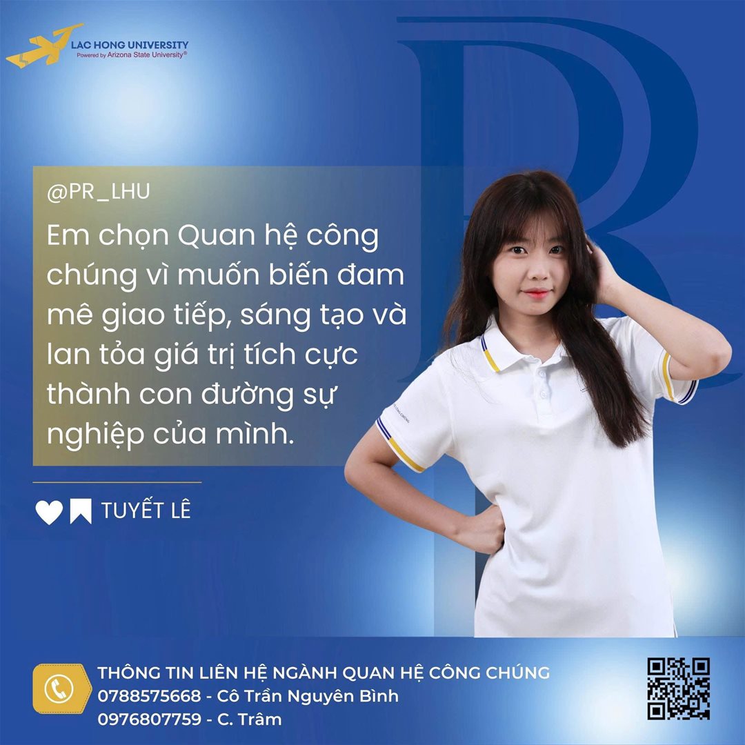 “Em chọn ngành Quan hệ công chúng vì em yêu thích giao tiếp, tổ chức sự kiện và mong muốn truyền tải thông điệp tích cực đến cộng đồng. Đại học Lạc Hồng có môi trường học năng động, giảng viên nhiệt tình và chương trình đào tạo thực tiễn. Em tin rằng đây là nơi phù hợp để em phát triển bản thân và theo đuổi đam mê trong lĩnh vực truyền thông.”