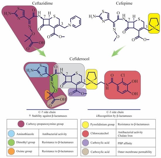 Cefiderocol has a unique hybrid chemical structure, sharing similarities with both ceftazidime (third-generation cephalosporin) and cefepime (fourth-generation cephalosporin), but with an additional catechol side chain at the C-3 position. Its antibacterial activity is based on two principal mechanisms: